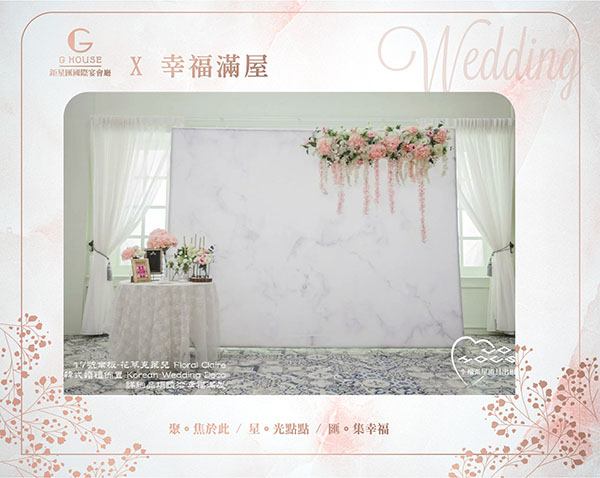 大理石質感的背板搭配粉色與白色的仿真花